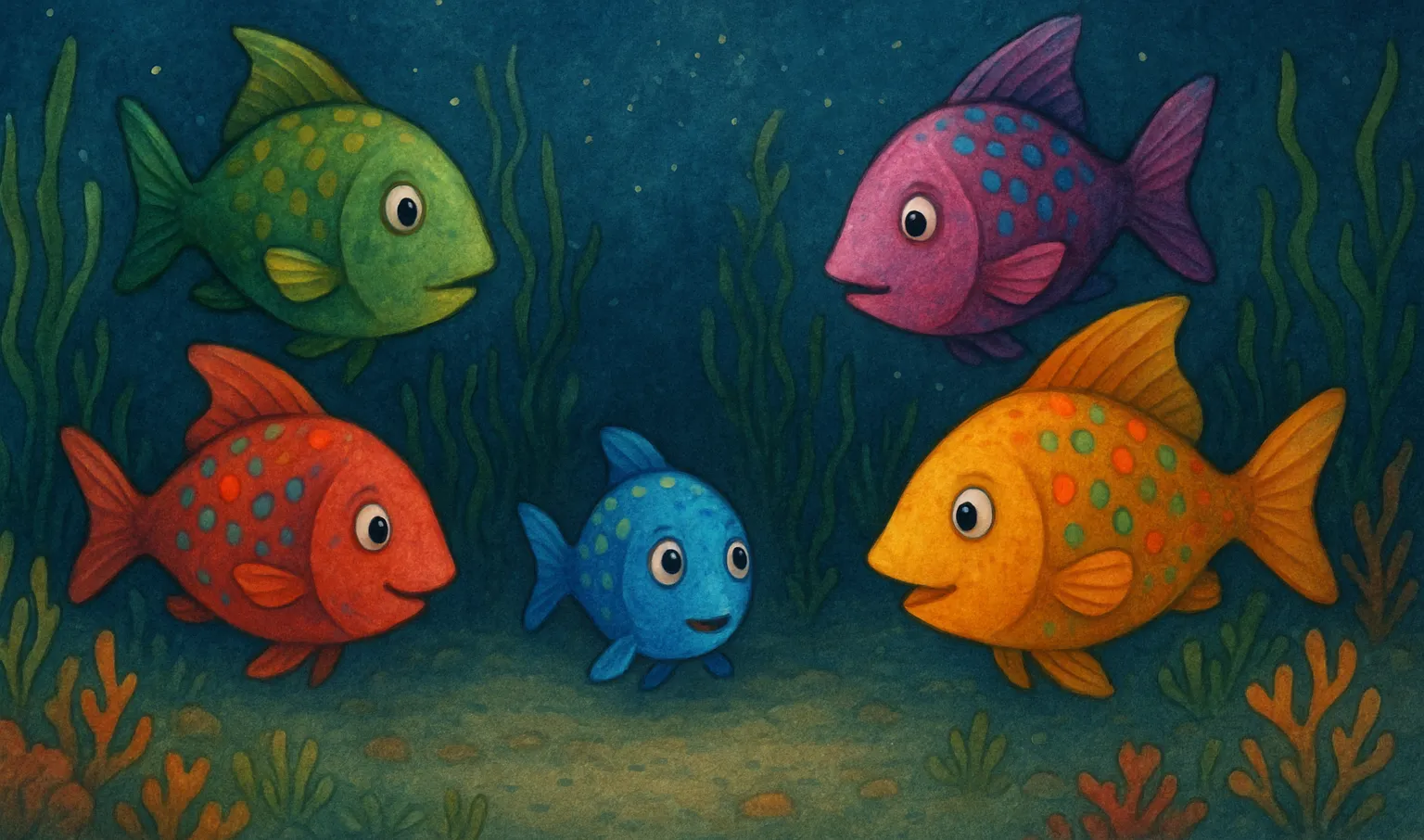 Bir zamanlar, derin denizlerin en huzurlu köşesinde Renkli Balıklar Ülkesi varmış. Burada her balık, farklı renkte pullara sahipmiş ve her akşam uykuya dalmadan önce bir araya gelip hikâyeler anlatırlarmış. Minik Mavi Balık ise gece olunca hep heyecanlanır, en güzel masalın anlatılmasını beklermiş.