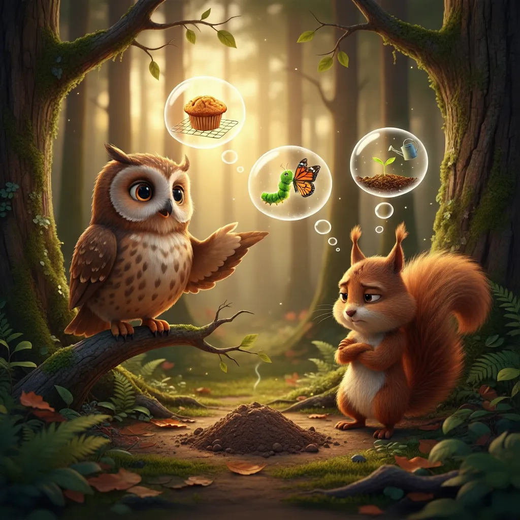 Tam o sırada Bilge Baykuş, kanatlarını sessizce çırparak yanına kondu. "Ne oldu, Kıpır? Sihri kullanmadın mı?" dedi. Kıpır somurttu. "Kullandım! 'Hadi büyü!' dedim ama işe yaramadı!" diye yakındı. Bilge Baykuş bilgece gülümsedi. "Ah, sevgili Kıpır. Bu tohumun sihri sözcüklerde değil, zamanda gizli. Adı 'Sabır'dır," dedi.