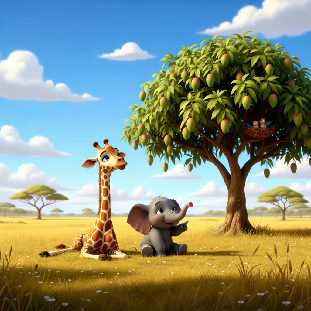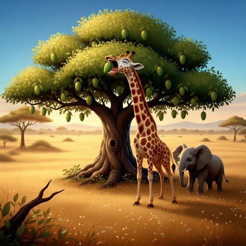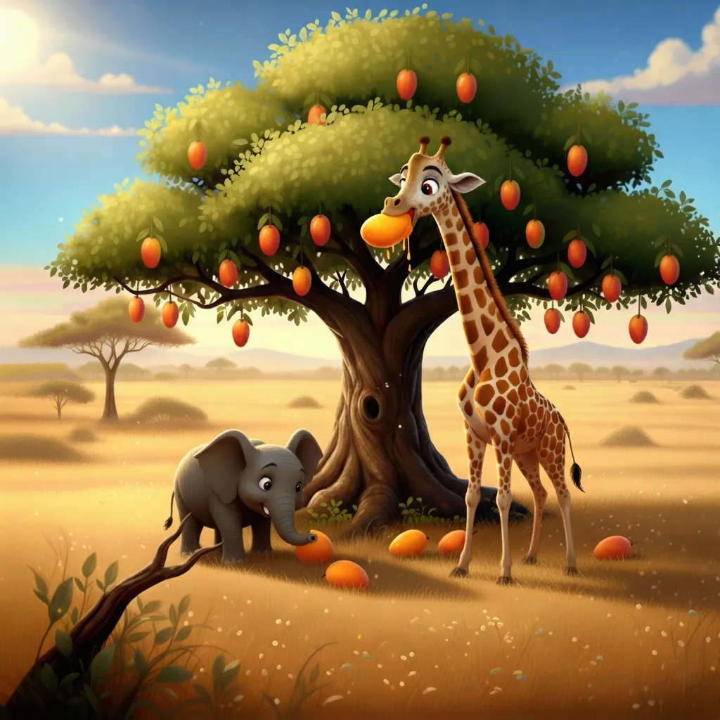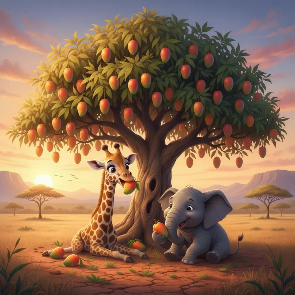 Bir gün, iki arkadaş savananın ortasındaki devasa Mango Ağacı'nın yanına gelmişler. Ağacın dalları, yeşil yeşil, sert görünümlü mangolarla doluymuş. Meraklı, "Yaşasın! Mango zamanı!" diye bağırmış. Uzun boynunu dallara uzatmış, en yakındaki mangoyu koparıp ısırmaya çalışmış. "Ayy! Dişim!" diye bağırmış. "Bu çok ekşi ve sert! Tıpkı bir taş gibi!"