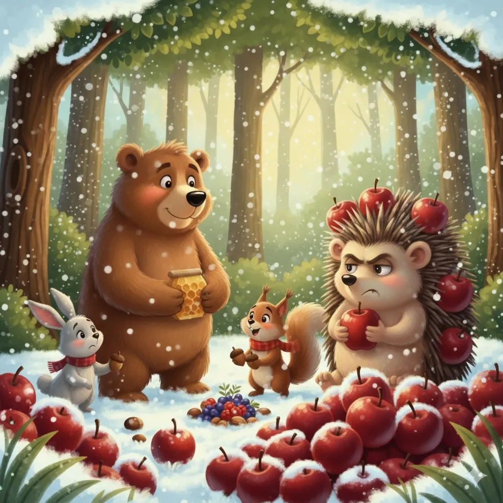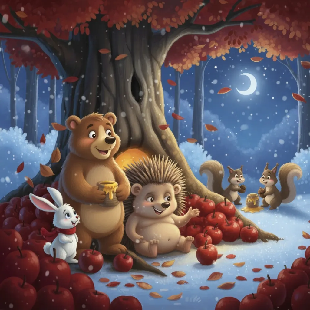 O gece ilk kar yağmış. Her yer bembeyaz olmuş. Keskincik sıcacık yuvasında, etrafı elmalarla çevrili oturuyormuş. Karnı tokmuş ama içinde bir gariplik varmış. Dışarıdan Ayı Pofuduk, Sincap Zıpır ve Tavşan Pıtır'ın seslerini duyuyormuş. Onlar, Pofuduk'un bulduğu son bir parça balı üçe bölüp paylaşarak gülüşüyorlarmış.