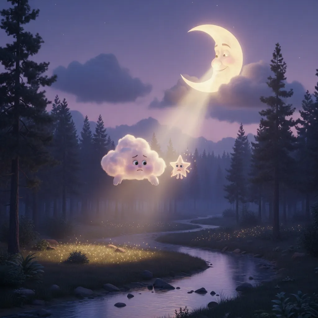 Pofuduk, endişelenen küçük yıldıza baktı. "Hemen bakalım," dedi. Ay Dede'den yardım istedi. Ay Dede, en parlak ışığını yeryüzüne gönderdi. Birlikte uyuyan ormanlara, sessiz nehirlere baktılar. Ama pırıltı hiçbir yerde yoktu.