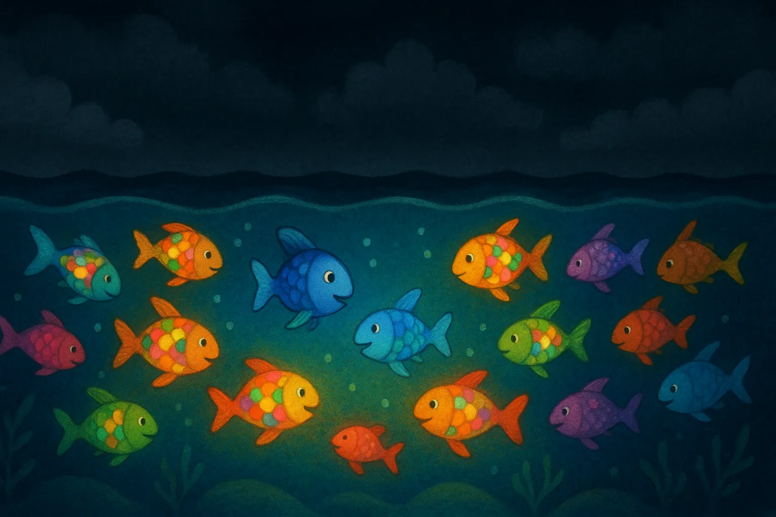 Bir gece, gökyüzü bulutlarla kapanmış ve ay ışığı denizi aydınlatamıyormuş. Balıklar biraz endişelenmiş. Minik Mavi Balık, "Karanlıktan korkmamıza gerek yok, birbirimize yardım edebiliriz!" demiş. Tüm balıklar bir araya gelmiş, pullarını birleştirip kendi ışıklarını oluşturmuşlar. Denizin altı rengârenk olmuş ve herkes neşeyle dans etmiş.