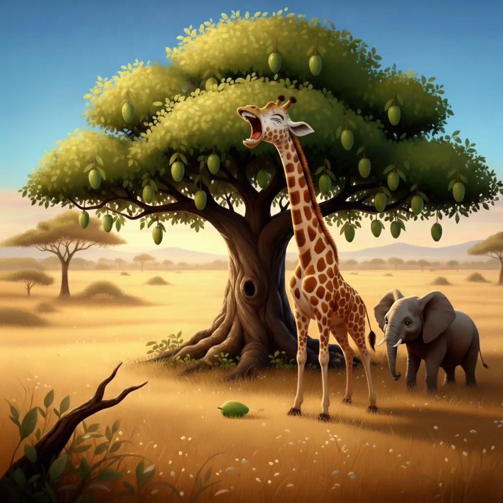 Bir gün, iki arkadaş savananın ortasındaki devasa Mango Ağacı'nın yanına gelmişler. Ağacın dalları, yeşil yeşil, sert görünümlü mangolarla doluymuş. Meraklı, "Yaşasın! Mango zamanı!" diye bağırmış. Uzun boynunu dallara uzatmış, en yakındaki mangoyu koparıp ısırmaya çalışmış. "Ayy! Dişim!" diye bağırmış. "Bu çok ekşi ve sert! Tıpkı bir taş gibi!"