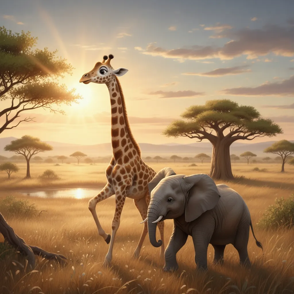 Güneşin gökyüzünde pırıl pırıl parladığı Afrika savanlarında, iki çok iyi arkadaş yaşarmış. Biri, uzun boynuyla her yere uzanmaya çalışan ama bir türlü yerinde duramayan meraklı zürafa yavrusu Meraklı'ymış. Diğeri ise sakin adımlarıyla dolaşan, kocaman kalpli fil yavrusu Tonton'muş.